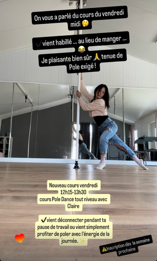 Claire vous propose un nouveau cours de pole dance pour tout niveau le vendredi de 12h15 à 13h30