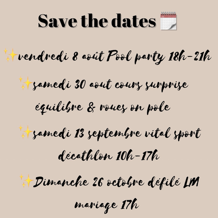 Une fois par mois un cours surprise à thème vous est proposé le samedi après-midi de 17h à 18h15.